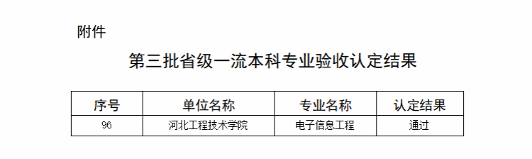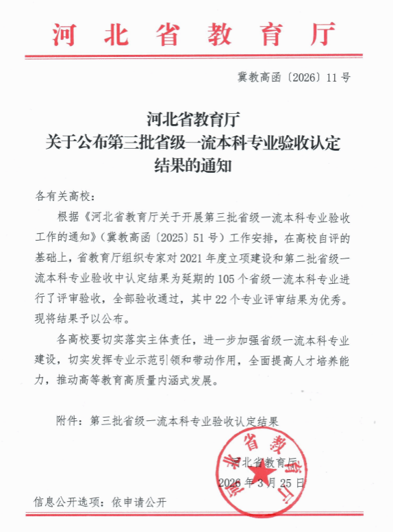 近日,河北省教育厅印发《关于公布第三批省级一流本科专业验收认定结果的通知》(冀教高函〔2026〕11 号),我校电子信息工程专业顺利通过验收认定。至此,我校土木工程、工程管理、建筑学、通信工程、国际经济与贸易、工程造价、电子商务、财务管理、电子信息工程9个专业已全部验收认定为省级一流本科专业。